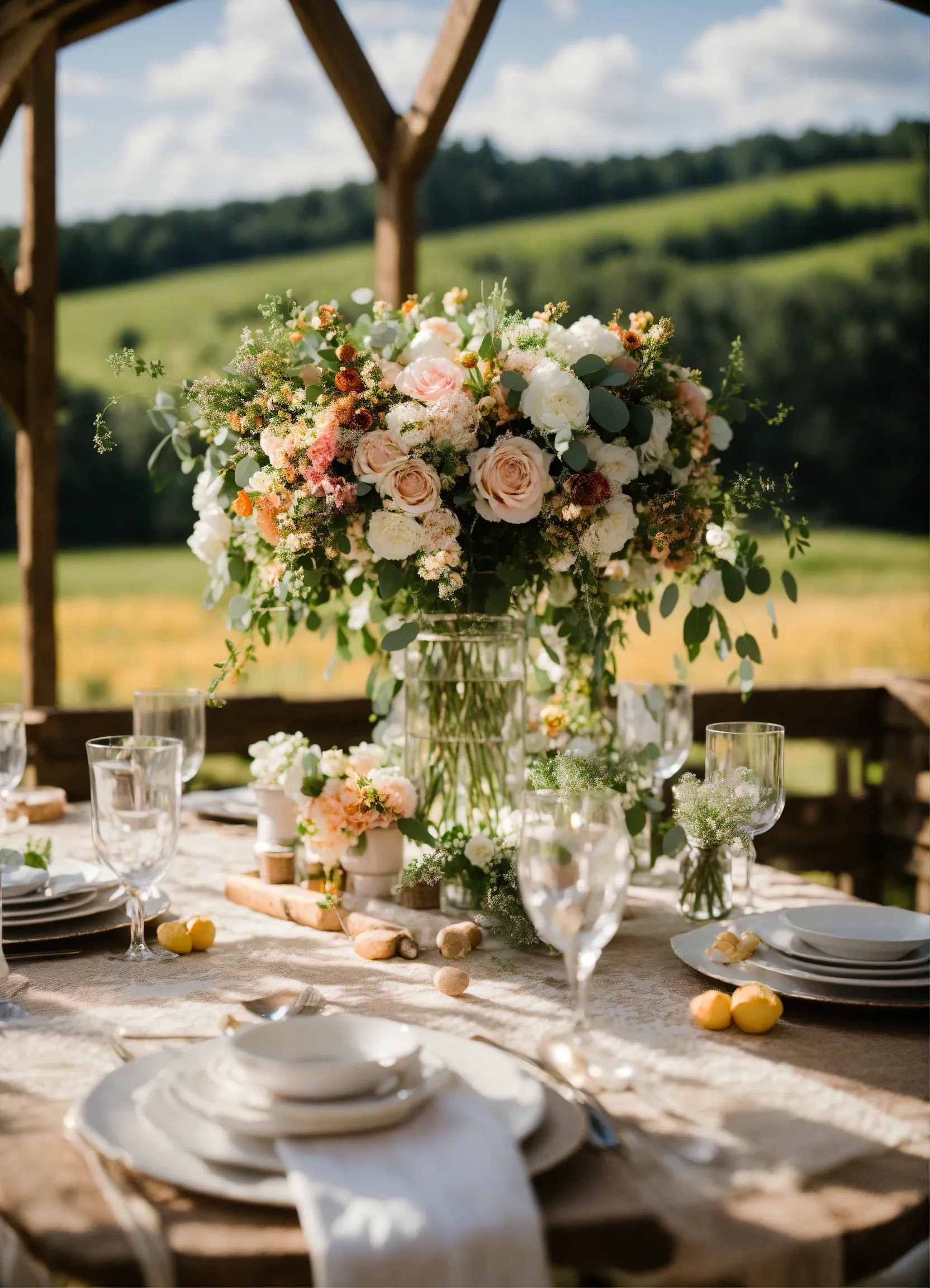 - Exchange vows under a rustic wooden arch adorned with greenery and florals.